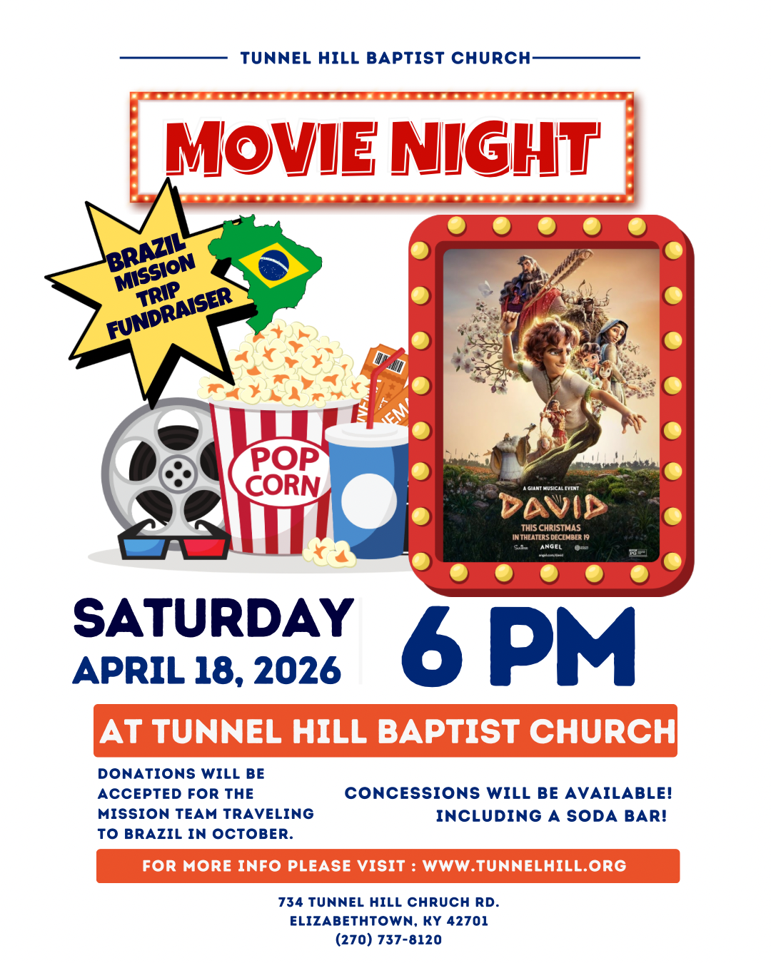 This Saturday (4/18) we will be showing the hit movie DAVID!!! The show is free to attend, but a love offering is encouraged to support our mission trip to Brazil.
